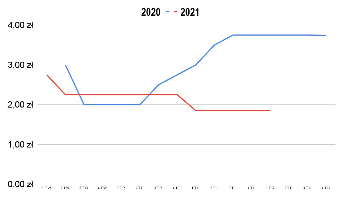 W ubiegłym roku Boskoop trafił do sprzedaży już pod koniec sierpnia, w tym roku dopiero w drugim tygodniu września. W obu sezonach obserwujemy szybki spadek ceny po rozpoczęciu sprzedaży w pierwszych dwóch tygodniach. Następnie następuje stabilizacja, jednak oba sezony diametralnie się od siebie różnią poziomem cen.