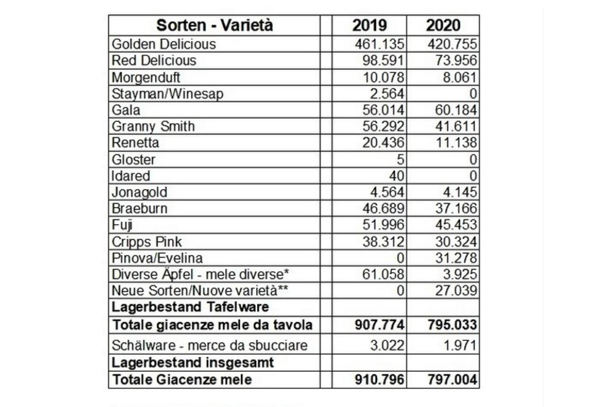 Dwie odmiany klubowe (Evelina i Pink Lady), których uprawia się we Włoszech najwięcej występują w zestawieniach osobno ze względu na tonaż. Obecnie i jednej i drugiej odmiany jest w chłodniach około 30 000 ton.