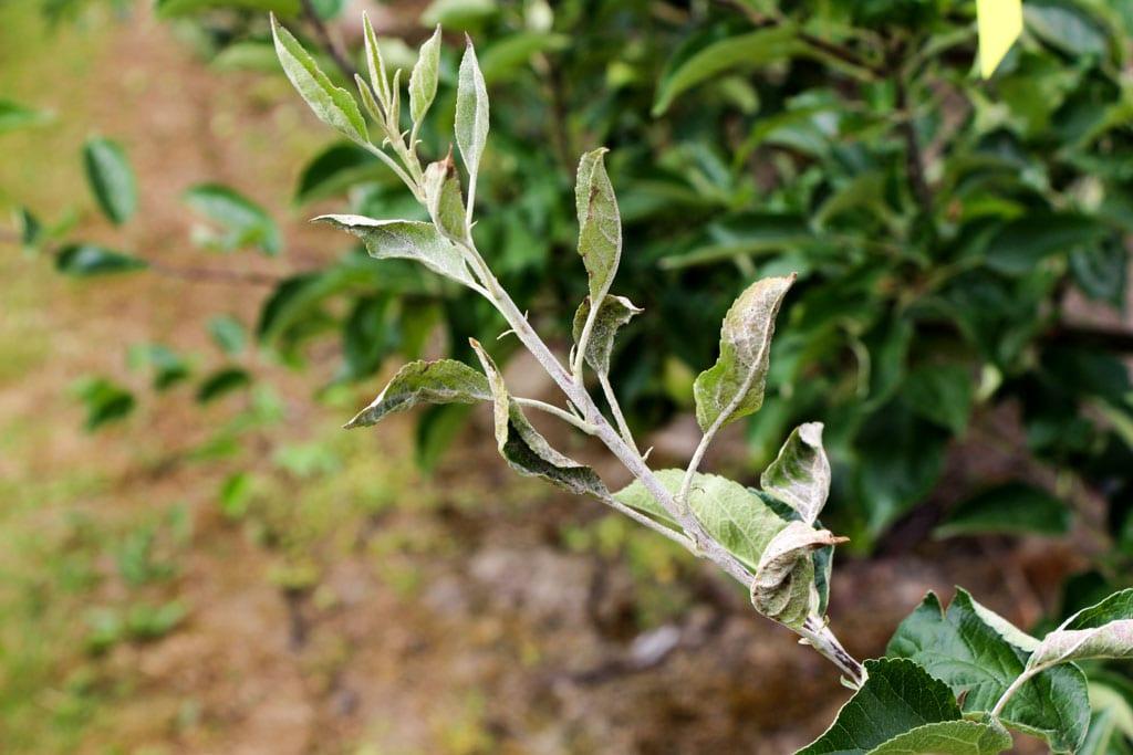 Podobna sytuacja dotyczy mączniaka jabłoni (fot. 5). Wiadomo było, że będzie to kolejny sezon intensywnej walki z tą chorobą. Zabiegi należało rozpocząć tuż po ruszeniu wegetacji. Dobrym rozwiązaniem były środki jednocześnie zapobiegające parchowi i zwalczające mączniaka. Dodatkowo przed ale także po zabiegach warto było wycinać fragmenty pędów czy rozety z objawami tej choroby. Jak twierdzi B. Błaszczyńska metoda mechaniczna może wspomóc ochronę chemiczną redukując kolejne infekcje nawet o 50%.
