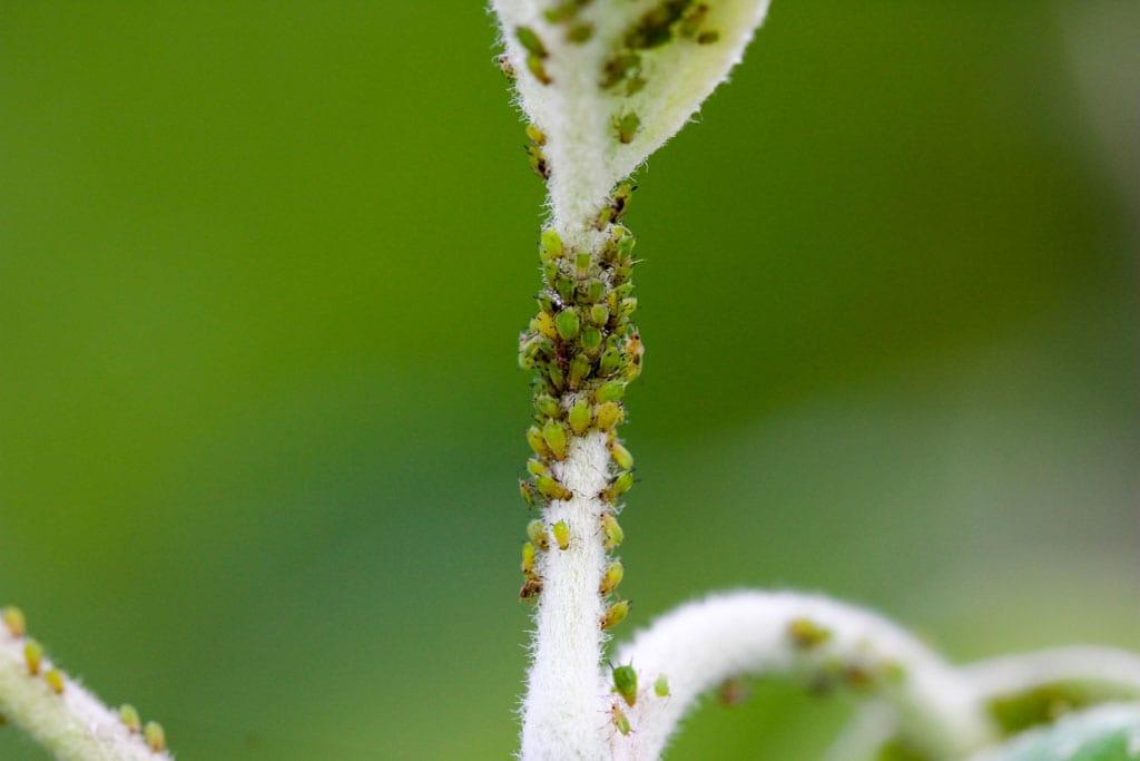 Wszyscy prelegenci zwracali uwagę na zagrożenie ze strony bardzo licznych w tym sezonie szkodników ssących: mszyc (fot. 6), bawełnicy, miodówek, przędziorków, pordzewiaczy. Jeśli nie wykonano zabiegu w sadach jabłoniowych w fazie zielonego/różowego pąka, obecnie nasilenie mszyc jest bardzo duże. B. Błaszczyńska zauważa od kilku sezonów, że możliwe jest przy współrzędnym występowaniu na roślinach mszyc, bawełnic, bielika klonowca oraz roztoczy i… pryszczarków wyeliminowanie wszystkich przy okazji jednego zabiegu środkiem Movento 100 SC.