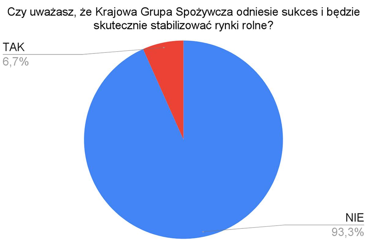 Optymizmu nie podzielają sadownicy. W przeprowadzonej przez nas ankiecie na 120 osób aż 112 (93,3%) respondentów uważa, że Krajowa Grupa Spożywcza nie odniesie zapowiadanego sukcesu i nie będzie w istotnym stopniu stabilizować rynków rolnych. Tylko 8 (6,7%) ankietowanych zgadza się z retoryką rządu. Pomimo stosunkowo niedużej grupy ankietowanych, wyniki pokazują wyraźnie, jakie opinie przeważają.