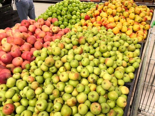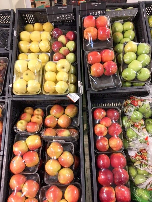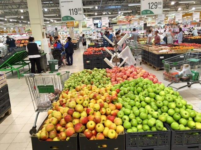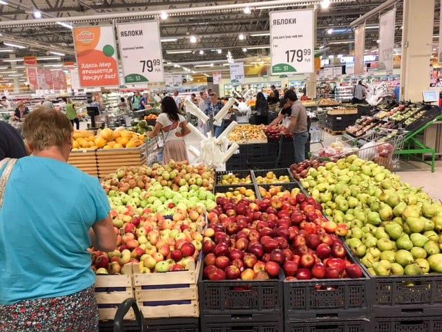 Sprawdziliśmy jak wyglądają ceny i oferta jabłek w moskiewskich supermarketach – w drugiej dekadzie sierpnia większość z nich oferuje bardzo szeroki wybór odmian zarówno pochodzących z Rosji (odmiany letnie) jak i z eksportu. Spora cześć owoców oferowanych w tej chwili to te importowane z półkuli południowej – Argentyny, Chile czy RPA.