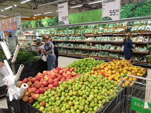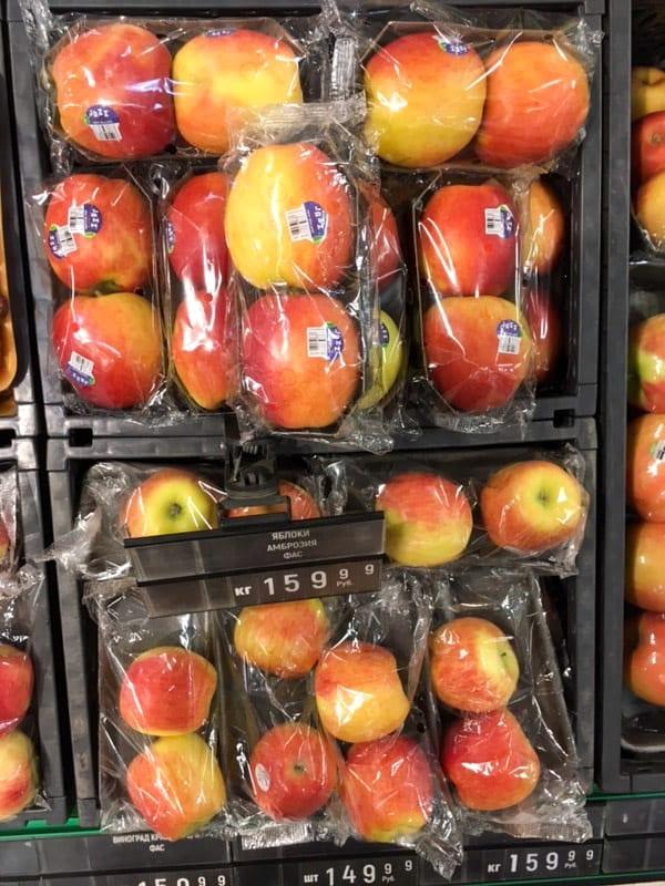 Odmiany letnie (z krajowych dostaw) można dzisiaj kupić za 79 rubli (4,3 pln), jabłka z importu (Granny, Fuji, Jazz, Golden) kosztują w zależności od opakowania i sklepu od 119 rubli (6,5 PLN) do aż 179 rubli (9,7 PLN). Gruszka kosztuje 129 rubli (7 złotych).
