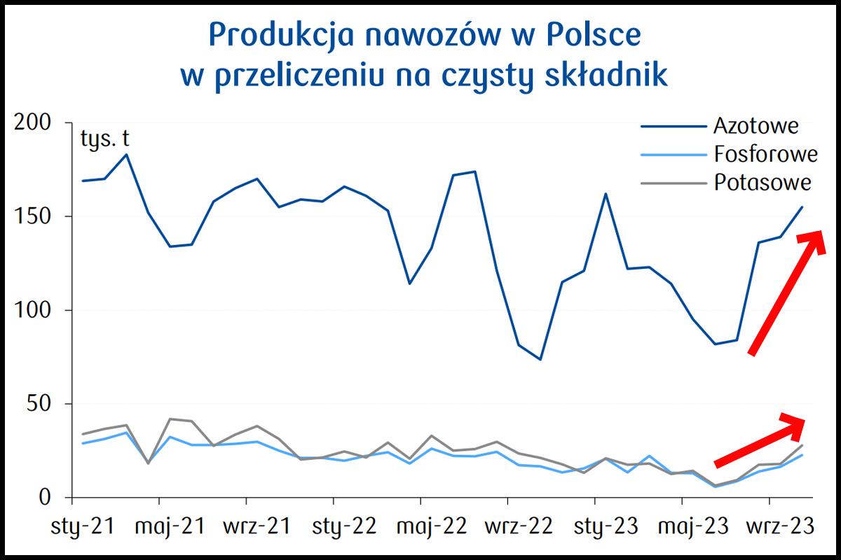 Sytuacja zaczęła poprawiać się dopiero jesienią 2023 roku, gdy europejskie ceny gazu pozostawały niskie, a producenci zaczęli zwiększać produkcję. Widzimy to na wykresie przygotowanym przez analityków banku. Produkcja w Polsce (w październiku 2023) była wyższa o 41% rok do roku.