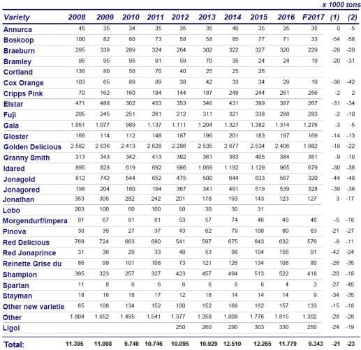 Nadal liderem pozostaje ‘Golden Delicious’ – prognozowane zbiory mają wynieść 1,982 mln ton. To będzie 18% mniej, niż w roku ubiegłym, a 22% mniej niż średnia za ostatnie trzy sezony. Drugą co do znaczenia odmianą jest ‘Gala’ – zbierze się jej 1,276 mln ton. Będzie jej o 2% mniej niż w 2016 r. i 5% mniej, niż w poprzednim trzyleciu. Idareda ma być 679 tys. ton, ale tu spadek w stosunku do poprzedniego wynosi 30% (38% za ostatnie 3 lata).