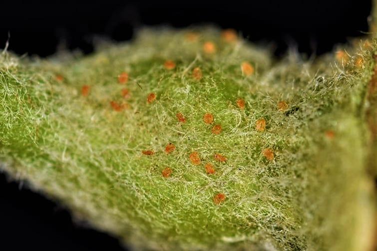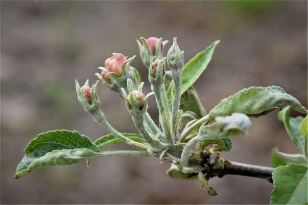 Bez problemu znajdziemy w sadach rozety liściowe i kwiatowe, na których rozwija się grzybnia mączniaka jabłoni (grzyb Podosphaera leucotricha). Charakterystyczny bielący się nalot jest skupiskiem formowanych na trzonkach zarodników konidialnych, które rozsiewane przez wiatr dokonują infekcji młodej tkanki (Fot.3). W odróżnieniu od sprawcy parcha jabłoni, zarodniki konidialne grzyba Podosphaera leucotricha nie potrzebują wody aby skiełkować, jednak w tym procesie niezbędna jest odpowiednia wilgotność względna powietrza, która powinna wynosić powyżej 70%. Takie warunki panują obecnie rankiem lub wieczorem, a do infekcji będzie dochodziło nawet w temperaturze > 50