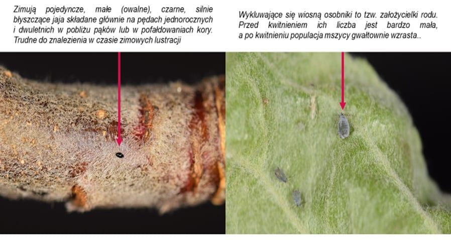 Lustrując sady obserwujemy w wielu miejscach stosunkowo wysoką presję ze strony mszyc, szczególnie tam gdzie do tej pory nie udało wykonać się zabiegu ochronnego. Wczesny wyląg mszycy jabłoniowo-zbożowej i jabłoniowej determinował rozpoczęcie ochrony już kilkanaście dni temu. Obecnie powinniśmy prowadzić systematyczną lustrację, przeglądając rozety liściowe i kwiatowe w poszukiwaniu przede wszystkim larw mszycy jabłoniowo-babkowej (Dysaphis plantaginea). Gwałtowny rozwój populacji tego gatunku zazwyczaj ma miejsce w późniejszym okresie, jednak przed kwitnieniem na jabłoniach obecne są wylęgające się z zimowych jaj osobniki będące założycielkami rodu (Fot.2.). To właśnie te larwy po okresie kwitnienie zbudują w sprzyjających warunkach pogodowych liczne kolonie, uszkadzając liście, deformując zawiązki, o czym mogliśmy przekonać się w ubiegłym sezonie.