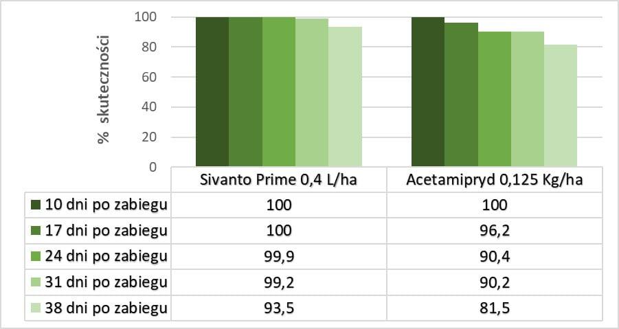 W poprzednim roku prowadziliśmy badania mające na celu ocenę skuteczności insektycydów w zwalczaniu mszycy jabłoniowo-babkowej w okresie przed kwitnieniem. Zabieg zwalczający wylegające się larwy został wykonany w okresie różowego pąka (kwiat królewski znajdował się w fazie balona). Na wykresie 1 widać jak rozkładała się skuteczność poszczególnych produktów, w tym preparatu Sivanto Prime w dawce 0,4 L/ha oraz produktu standardowego na bazie acetamiprydu. Wysoka skuteczność Sivanto Prime pozwalała efektywnie wyniszczyć żerujące osobniki mszycy jabłoniowo-babkowej i skutecznie zahamować rozwój populacji na bardzo długi okres.
