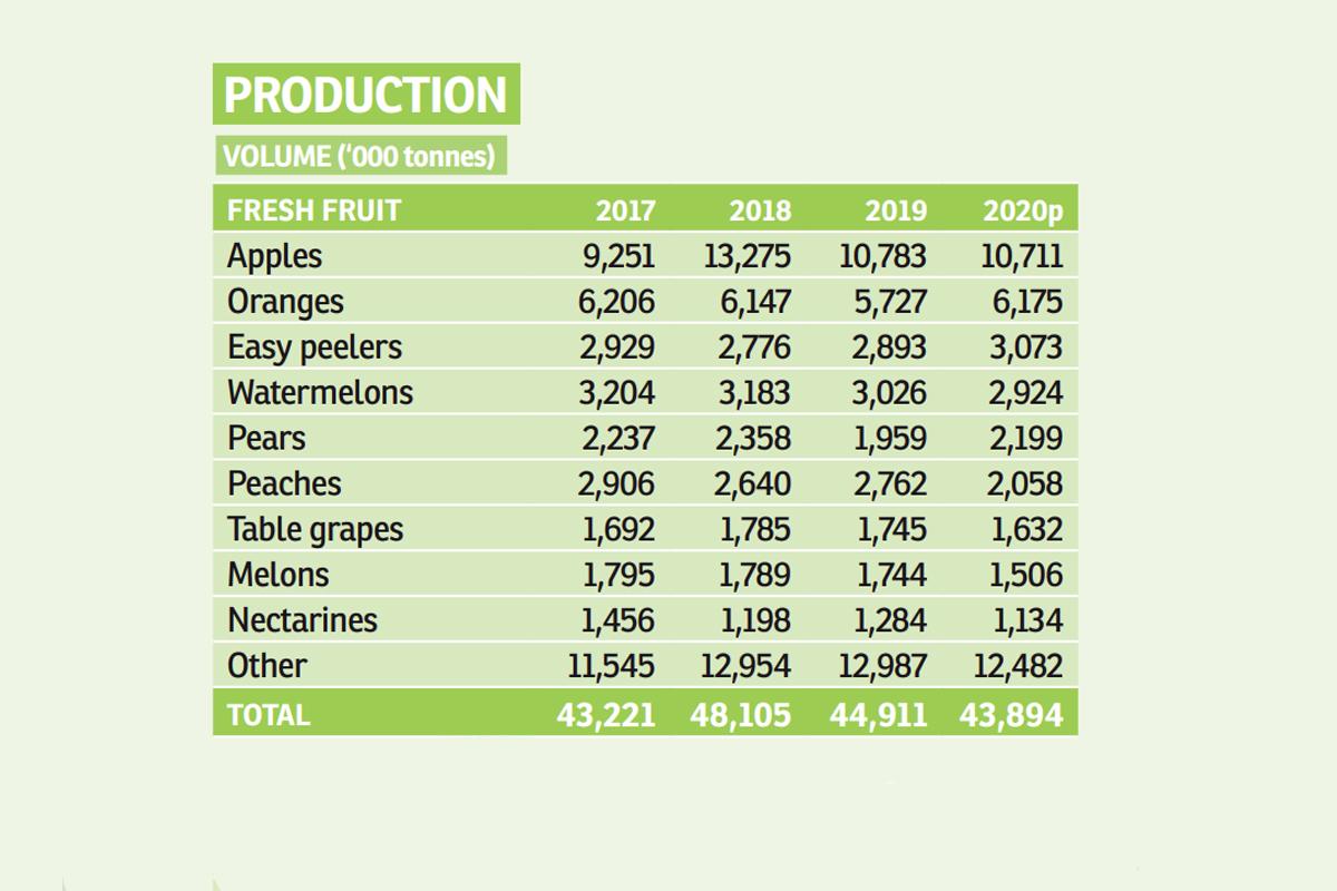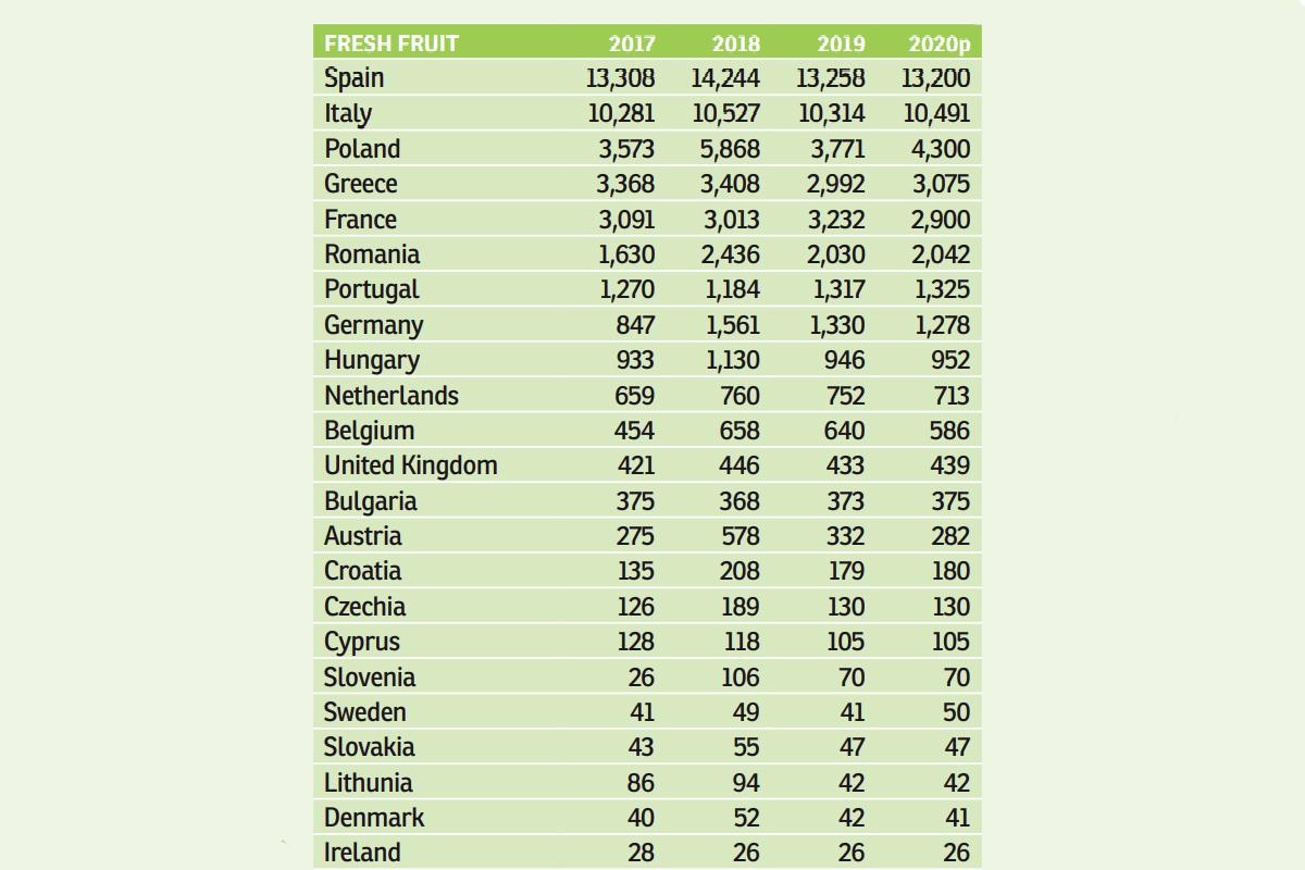 Niezmiennie największym producentem owoców jest Hiszpania (13,3 mln ton) na drugim miejscu znalazły się Włochy (10,4 mln ton). Podium zamyka nasz kraj z produkcją owoców na poziomie 4,3 miliona ton.