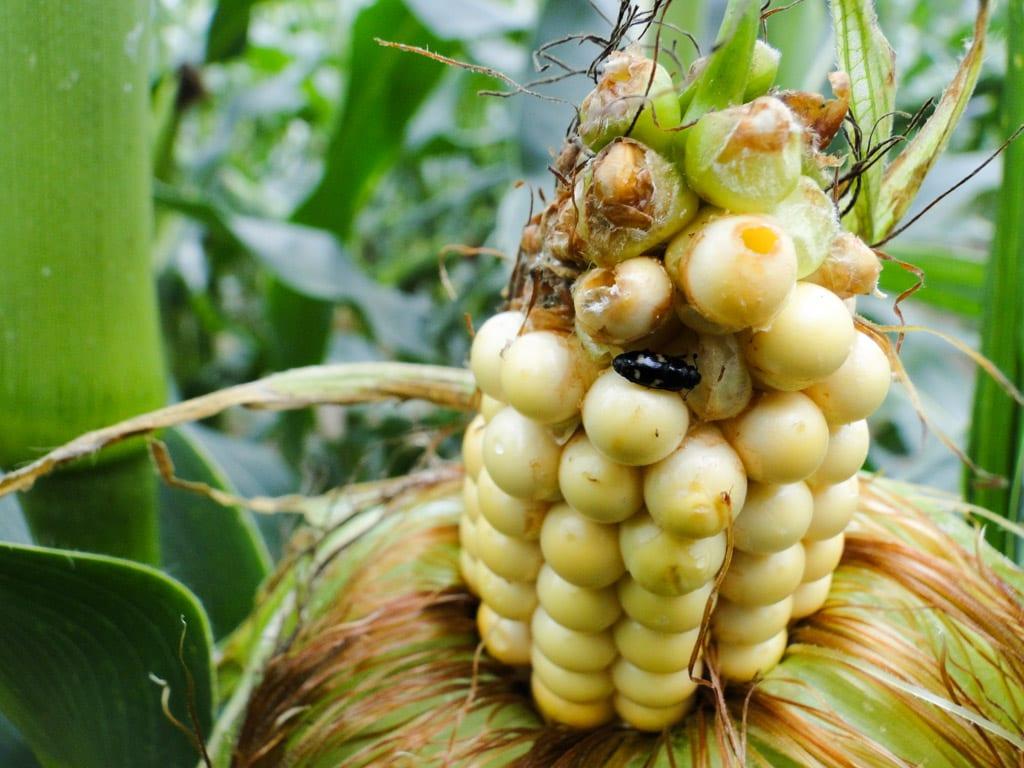 Urazek kukurydziany dotychczas kojarzony był głównie z uprawami kukurydzy, stąd też producenci tej rośliny już go znają. Obecnie najliczniej można go spotkać właśnie w uprawach kukurydzy (w tym cukrowej), gdzie wyjada zawartość miękkich ziarniaków (fot. 2). Znajdować się może także wewnątrz łodyg, które uległy złamaniu na skutek żerowania omacnicy prosowianki.