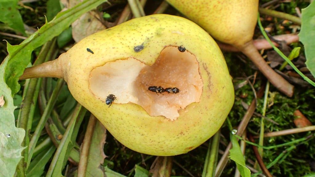 Szczególnie jednak chętnie urazek żeruje na opadłych owocach (fot. 3) wskutek nawałnic, jakie przetaczają się przez kraj, tudzież lokalnego uszkodzenia roślin przez grad. Dojrzałe owoce leżące na glebie lub zranione przez czynniki pogodowe i inne szkodniki są doskonałym miejscem ich żerowania. Zapach unoszący się z uszkodzonych tkanek, które zaczynają przy wysokiej temperaturze szybko fermentować lub gnić (fot. 4) działa jak feromon pokarmowy – nie tylko zwabia szkodnika, ale także stymuluje jego żerowanie.