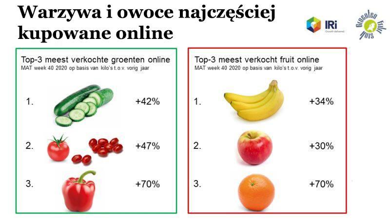 Obecnie po kolejnych restrykcjach, wprowadzonych pod koniec września udział owoców i warzyw sprzedawanych online w holenderskich supermarketach wzrósł do rekordowych 6%.