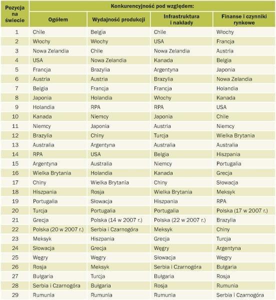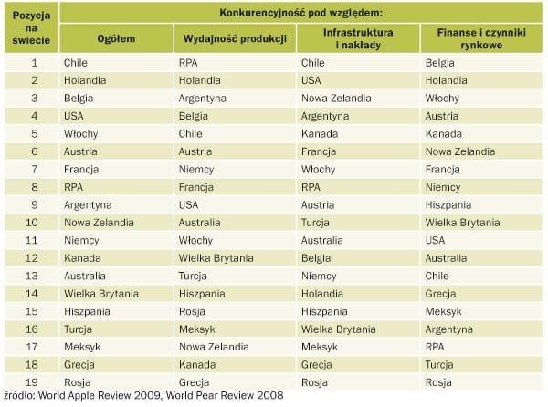 Raz w roku ekonomista i ekspert w dziedzinie sadownictwa dr Desmond O’Rourke (prezes firmy Belrose Inc. z USA) publikuje raport na temat konkurencyjności branży sadowniczej na świecie. Dokument przygotowywany jest dla jabłek (tab. 1) i dla gruszek (tab. 2). Raport zawiera m.in. ranking krajów, których sadownictwo jest najbardziej konkurencyjne na świecie. Ostatni raport z marca 2009 roku pokazuje, że palmę pierwszeństwa w przypadku jabłek dzierżą niezmiennie od kilku lat sadownicy z Chile. Na drugim miejscu znalazły się Włochy, które wyprzedziły w ostatnim roku Nową Zelandię. Czwarte i piąte miejsce zajęły odpowiednio USA i Francja. Kiepsko w tym zestawieniu wygląda pozycja Polski, która zajęła dopiero 22 miejsce (19 jeszcze w 2006 roku). Pomijając dużych graczy w produkcji sadowniczej (np. Francję, Chiny, Belgię, Holandię) wyprzedziły nas także takie kraje, jak Portugalia, Hiszpania, Turcja czy Grecja.