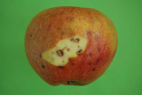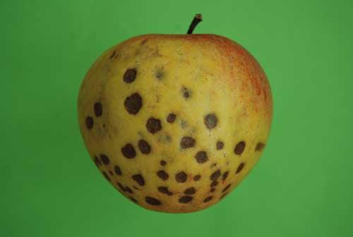 Pierwsze objawy choroby mogą pojawić się na owocach już w sadzie. Początkowo widoczne są na skórce w postaci zielonych (po stronie barwy podstawowej) i czerwonych do purpurowych (po stronie rumieńca) plamek o średnicy kilku milimetrów. Zwykle, pierwsze plamki pojawiają się od strony kielichowej owocu. Z czasem komórki w warstwie miąższu tuż pod powierzchnią przebarwionej skórki obumierają (fot. 1) i wskutek utraty przez nie wody dochodzi do zapadania się tkanek. Skórka w obrębie plam przybiera wtedy kolor od szarego do brązowego i zagłębia się, a miąższ staje się suchy i skorkowaciały. W wyjątkowych przypadkach plamy mogą pojawiać się niemal na całej powierzchni owocu (fot. 2). W owocach niektórych odmian zmiany zachodzą w głębszych warstwach miąższu i uszkodzone komórki widoczne są dopiero po przekrojeniu jabłka (fot. 3). Objawy choroby mogą pojawić się zarówno podczas sezonu wegetacyjnego, jak i po zbiorze owoców w czasie przechowywania.