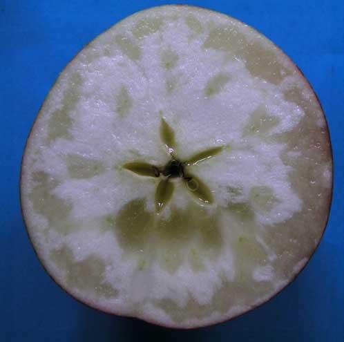 Choroba ta ujawnia się w owocach jeszcze przed ich zbiorem z drzew. Zaburzenia dotyczą najczęściej tkanek w pobliżu wiązek sitowo-naczyniowych lub w okolicach gniazda nasiennego (fot. 4). Miąższ przybiera w tych miejscach wygląd wodnisty, szklisto-przezroczysty. Niekiedy zmiany chorobowe uwidaczniają się także na powierzchni owocu, przybierając postać ciemniejszych, rozmytych i błyszczących plam (fot. 5), przy czym także w miąższu są wówczas bardzo rozległe (fot. 6).