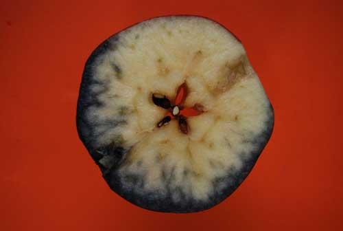 Jest to kolejna choroba fizjologiczna, a właściwie uszkodzenie owoców (fot. 8). Na uszkodzenia narażone są szczególnie jabłka wystawione na bezpośrednie działanie silnie operujących promieni słonecznych w upalne lata. Najczęściej więc dochodzi do tego po cięciu letnim, tzw. odsłaniającym, wykonywanym w celu poprawy wybarwienia owoców znajdujących się wewnątrz korony. Skutki działania wysokiej temperatury na owoce można łatwo dostrzec podczas wykonywania testu skrobiowego. Jego cechą charakterystyczną jest niemal całkowity rozkład skrobi (brak zabarwienia w teście skrobiowym) od strony zacienionej owocu i brak rozkładu skrobi (ciemne zabarwienie) od strony rumieńca, gdzie owoce uległy uszkodzeniu słonecznemu (fot. 9). Tego typu uszkodzenia bardzo często opisywane są jako „połówkowy” rozkład skrobi. Można stwierdzić, że jest to metoda znacznie czulsza niż obserwacja rumieńca. Przypadki połówkowego rozkładu skrobi obserwowaliśmy bowiem również na owocach o praktycznie niezmienionym rumieńcu. Jeżeli podczas testu stwierdziliśmy obecność uszkodzeń, to powinniśmy być świadomi, że trwałość owoców podczas przechowywania jest znacznie ograniczona, zwłaszcza gdy notowaliśmy również wyraźną różnicę w jędrności miąższu pomiędzy stroną z rumieńcem i tą z barwą podstawową skórki. Podczas przechowywania jabłek różnica ta z reguły jeszcze się powiększa. Jędrność po stronie „oparzonej” jest wyższa niż po stronie przeciwległej. Dodatkowo strona „zacieniona” szybciej będzie ulegać rozpadom.