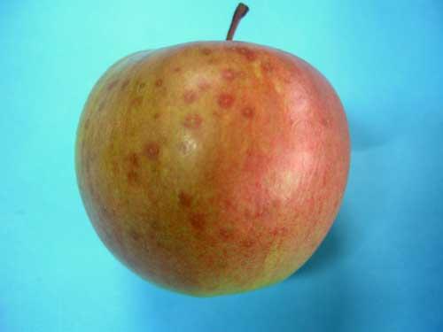 Kilka lat temu w sadach pojawiły się „tajemnicze plamki” na jabłkach. Przebarwienia te uwidaczniały się w sierpniu i wrześniu (okres zmienny w różnych rejonach kraju). Występują one wokół przetchlinek tworząc charakterystyczne zaczerwienienie (efekt typowy dla uszkodzenia skórki owocu), a następnie często dochodzi do skorkowacenia przetchlinki (fot. 10). Jeżeli uszkodzenia dotyczą owoców odmian o intensywnym rumieńcu, to wraz z rozwojem czerwonej barwy plamki „zlewają się” z rumieńcem, przez co ulegają zamaskowaniu. Niestety, na odmianach bez intensywnego rumieńca plamki mogą stanowić poważny problem w handlu, ponieważ są widoczne nawet na owocach po przechowywaniu. Niekiedy w uszkodzonych miejscach dochodzi do wtórnego zakażenia patogenami, w efekcie tkanki gniją.