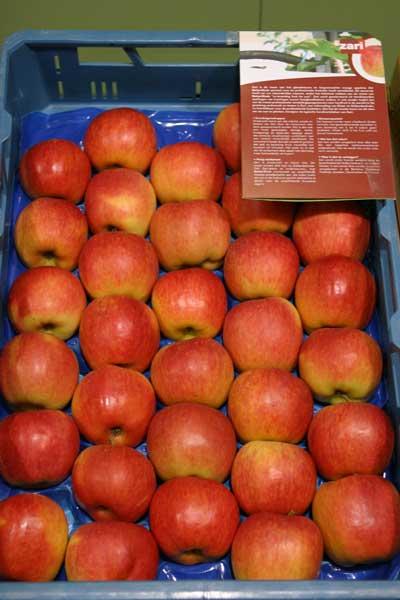 Inne wczesne jabłko – ‘Zari’ (fot. 5) – prezentowały szkółki René Nicolaï n.v. oraz bvba Carolus. Odmiana ‘Zari’ została otrzymana w holenderskiej firmie Better3fruit (jej największym sukcesem były dotychczas odmiany Kanzi® i Greenstar®) jako krzyżówka ‘Elstar’ x ‘Delcorf’ i nie będzie dystrybuowana jako jabłoń klubowa. W Belgii owoce ‘Zari’ dojrzewają pod koniec sierpnia (tydzień po ‘Delcorfie’). Jabłka mają regularny stożkowaty kształt, średnicę 70-80 mm i skórkę pokrytą w 75% paskowanym czerwonym rumieńcem na zielonożółtym tle. Miąższ ma być kruchy i soczysty o średniej jędrności 7 kG/cm