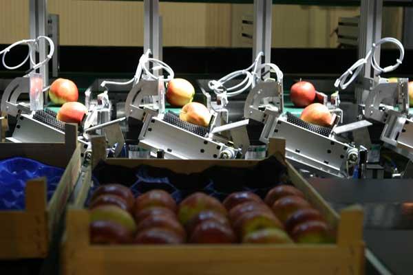 Belgijskie przedsiębiorstwo Visiomatics NV zaprezentowało robota o nazwie Orient 6 do układania jabłek lub gruszek na wytłoczkach. Czterościeżkowe urządzenie sprzężone jest z systemem kamer oraz programem komputerowym. Pozwala na układanie jabłek rumieńcem do góry oraz ogonkami w jedną stronę (fot. 8) na wytłoczkach jednowarstwowych lub dwuwarstwowych. Można też dodać opcję selekcji owoców ze względu na wady skórki. Wydajność urządzenia to 400 kg na godzinę, a cena podstawowego modelu około 120 tys. euro.