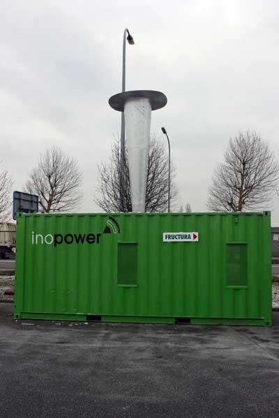 Najwyższym urządzeniem na targach było działo przeciwgradowe (fot. 13) belgijskiej firmy Inopower. Wytwarza ono fale uderzeniowe, które docierając do górnych warstw atmosfery powodują destabilizację kryształów lodu. Zamiast gradu na ziemię spada deszcz lub mokry śnieg. Fale uderzeniowe powstają przez spalanie w komorze spalania mieszaniny acetylenu, tlenu i azotu. System zasilany jest przez 12 V panele słoneczne. Może być uruchamiany manualnie, za pomocą fal radiowych lub za pośrednictwem sieci GSM (sms). Jeden kompletny zestaw (około 42 tys. euro) może chronić obszar 80 ha (1 km2). Koszty obsługi wynoszą w Belgii około 500 euro rocznie (zakup 8 butli z acetylenem i 8 ze sprężonym powietrzem, co starcza na 6 godzin pracy). Urządzenie należy uruchomić na 20-25 minut przed spodziewanym opadem gradu.