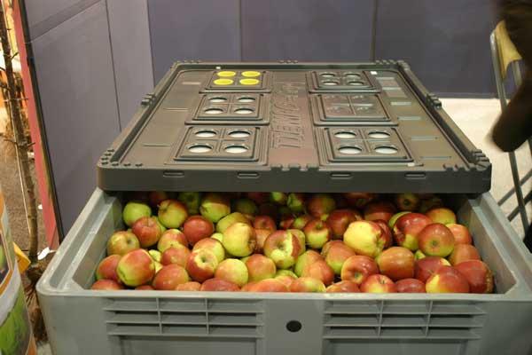 Belgijska firma Fyto Vrancken przedstawiła na targach interesujące rozwiązanie do przechowywania niewielkich ilości owoców w skrzyniopaletach, w których wytwarzana jest modyfikowana atmosfera. Skrzyniopalety o nazwie Mat Tiempo wykonane są z tworzywa sztucznego i mają dopasowaną szczelną pokrywę z membranami (fot. 15), które przepuszczając różne składniki gazowe doprowadzają do wytworzenia wewnątrz zmodyfikowanej atmosfery. Kontrolując stężenie tlenu i dwutlenku węgla wewnątrz skrzyni i zakładając przykrywki na część membran można modyfikować skład atmosfery w zależności od przechowywanych owoców. Skrzyniopalety można ustawić w zwykłej chłodni i wykorzystywać dla jabłek, czereśni czy śliwek. Pojedynczy moduł kosztuje około 300 euro.