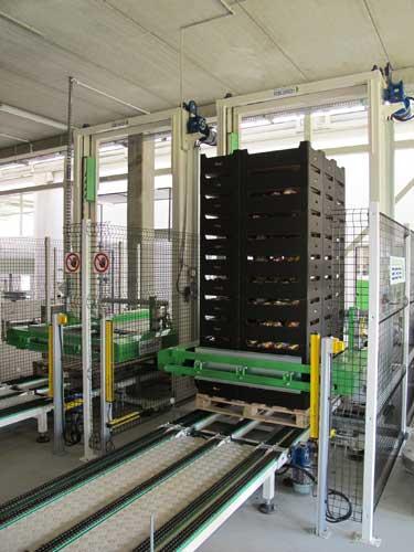 Każda z 4 linii sortujących zaczyna się wodnym rozładunkiem owoców, które następnie wędrują poprzez suszarki na stoły. Pierwszy z nich jest uniwersalny. Jabłka można pakować w wytłoczki, „luzem” w opakowania kartonowe oraz w torebki foliowe (1-3-kg – fot. 4). Specjalna przystawka umożliwia także pakowanie w woreczki raszlowe, których poszukują jeszcze niektórzy odbiorcy. Druga linia to tzw. stół dynamiczny, na którym owoce można pakować na wytłoczki (pojedyncze lub ułożone w 2 warstwy). Jest on także wyposażony w maszynę do umieszczania jabłek „luzem” w opakowaniach kartonowych. Trzecia linia kończy się stołem, z którego można pakować owoce na wytłoczki, ale ma on także przystawkę do pakowania jabłek na foliowane tacki. Czwarta linia to maszyna Optiline, która automatycznie pakuje jabłka na wytłoczki i układa te ostatnie w opakowaniach jedno- lub dwuwarstwowych.