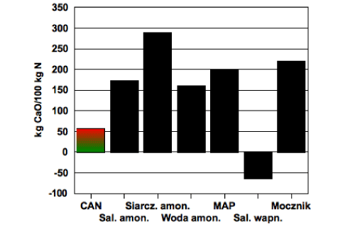 Azot jest składnikiem pokarmowym odpowiadającym przede wszystkim za wzrost drzew, przyrost masy. Należy również do grupy składników pobieranych przez drzewa owocowe w dużych ilościach. Stosowanie nawozów azotowych jest więc konieczne dla prawidłowego wzrostu i owocowania. Nie bez znaczenia jest natomiast prawidłowy dobór nawozu azotowego do warunków glebowych w sadzie. Nie zawsze nawozy najbogatsze w ten składnik będą wyborem optymalnym. Doskonałym przykładem jest mocznik zawierający ponad 46% azotu. Pamiętać jednak należy, iż jest to sztuczny nawóz organiczny, a udostępnianie azotu dla roślin może wiązać się z dużymi stratami tego składnika (nawet do 40%), zwłaszcza wtedy, gdy mocznik stosujemy na powierzchnię gleby bez przykrywania. Dodatkowo, mocznik należy do grupy nawozów silnie zakwaszających glebę (wykres), a zatem wpływa również na ograniczenie dostępności dla drzew takich składników, jak wapń, potas i magnez.