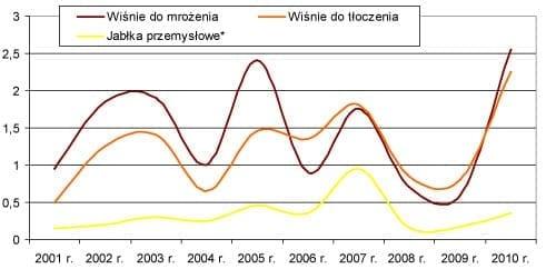 Duży spadek zbiorów spowodował bardzo istotny wzrost cen skupu wiśni (rys. 2). W przypadku owoców wcześniejszych odmian przeznaczonych dla przetwórstwa, ceny oscylowały wokół 1,5-2 zł/kg i były ponad dwukrotnie wyższe niż w 2009 r. Ceny oferowane przez zakłady przetwórcze za przeznaczone do mrożenia owoce ‘Łutówki’ (dominującej w skupie realizowanym przez przemysł) w początkowym okresie oscylowały wokół 2,5-2,7 zł/kg (loko zakład), a na początku sierpnia przekroczyły w niektórych zakładach 3 zł/kg. Przeciętne ceny wiśni przeznaczonych do mrożenia wyniosą 2,5-2,6 zł/kg, co oznacza trzykrotny wzrost w porównaniu z tymi z 2009 r. Ceny skupu wiśni są najwyższe w obecnej dekadzie. Ponad trzykrotnie wyższe (na poziomie 2-2,3 zł/kg) są również ceny skupu wiśni przeznaczonych do produkcji zagęszczonego soku. Wzrost cen, niezależnie od dużego spadku zbiorów, jest też rezultatem wyraźnego konkurowania o surowiec zakładów sektora sokowniczego i zamrażalniczego. Podrożały także wiśnie deserowe (ok. 10-15% produkcji towarowej tych owoców), za które płacono dwa razy więcej niż w 2009 r. W tym sezonie produkcja wiśni była opłacalna dla producentów. W dwu poprzednich latach ceny skupu stanowiły około 50% kosztów produkcji tych owoców. Niskie ceny w latach 2008-2009 przyczyniły się do zaniedbania sadów wiśniowych, co również miało wpływ na poziom zbiorów tych owoców w 2010 r.
