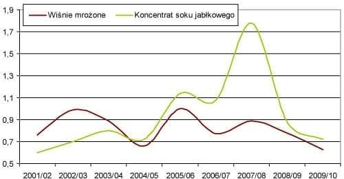 Zmniejszenie zbiorów jabłek w Polsce spowoduje wzrost cen skupu jabłek, zarówno kierowanych dla przetwórstwa (rys. 2), jak i przeznaczonych do spożycia bezpośredniego. Przewiduje się, że w sezonie 2010/11 r. ceny płacone przez zakłady produkujące zagęszczony sok jabłkowy przekroczyć mogą 0,30 zł/kg, wobec 0,15-0,17 zł/kg w dwu poprzednich sezonach. Wyższe od spodziewanych w obecnym sezonie, były jedynie ceny skupu jabłek przemysłowych w sezonach 2007/08 r. i 2005/06 r. Ceny eksportowe koncentratu jabłkowego, z uwagi na spadek podaży w Polsce i w Europie, będą wyższe niż w 2009/10 r., kiedy to wynosiły 0,72 euro/kg. O ostatecznym ich poziomie zadecyduje jednak podaż koncentratu z Chin. Wielkość eksportu w latach 2009/10 wskazuje, że chińskie zapasy tego produktu będą duże jeszcze na początku sezonu bieżącego (100-250 tys. ton). Utrzymanie opłacalności produkcji zagęszczonego soku jabłkowego na poziomie z sezonu 2009/10, przy cenach skupu wynoszących 0,30-0,35 zł/kg, wymagałoby uzyskania cen eksportowych (rys. 3) na poziomie ok. 1-1,2 euro/kg (przy kursie 4 zł/euro). W obecnej dekadzie ceny eksportowe powyżej 1 euro/kg notowane były jedynie w sezonach 2005/06-2007/08.