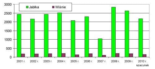 W 2010 r. warunki wegetacji były bardzo niekorzystne dla drzew i krzewów owocowych. Chłodna i deszczowa pogoda utrudniała lub wręcz uniemożliwiała prowadzenie ochrony upraw sadowniczych, a w konsekwencji nasiliło się występowanie chorób i szkodników. Ponadto z uwagi na zimno i opady deszczu w czasie kwitnienia niedostateczny był oblot pszczół, co wpłynęło na słabe zawiązanie owoców. Niekorzystnie na poziom plonów i jakość owoców wpłynęła też lipcowa susza. Według wstępnych szacunków GUS, globalne zbiory owoców z drzew obniżą się w stosunku do danych z 2009 r. o 18% i wyniosą 2,55 mln ton. Zbiory wiśni (według GUS) spadły o 18% do 155 tys. ton, a jabłek obniżą się o 17% do 2,18 mln ton (rys. 1). Według ocen producentów i innych uczestników rynku, spadek zbiorów wiśni był jednak znaczniejszy (nawet o 50%). Wyższe od lipcowego szacunku GUS może być też zmniejszenie zbiorów jabłek.