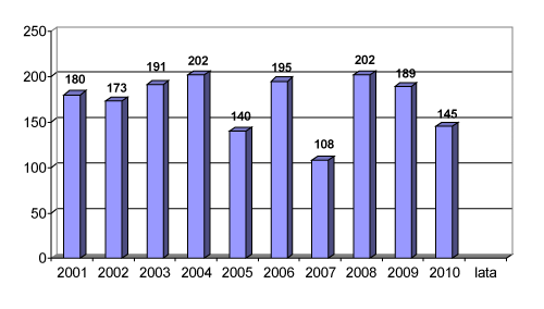 Według wrześniowych szacunków GUS zbiory wiśni w 2010 r. były niższe niż w roku poprzednim o 24% i wyniosły 145 tys. ton (rys. 1). O spadku zadecydowały bardzo niekorzystne warunki pogodowe w całym okresie wegetacji, a zwłaszcza rozwój chorób po nadmiernych opadach deszczu i przy ograniczonych możliwości prowadzenia zabiegów ochrony. Mniej tych owoców zebrano także w innych krajach europejskich, w tym w Serbii i na Węgrzech – czołowych, obok Polski producentach wiśni w Europie, a równocześnie liczących się eksporterach przetworów z tych owoców na rynek unijny.