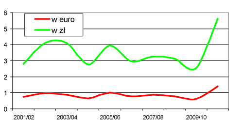 Głębokie zachwianie równowagi podażowo-popytowej spowodowało silny wzrost cen przetworów z wiśni na rynku europejskim (ale też światowym) i w polskim eksporcie. Przewiduje się, że w sezonie bieżącym ceny eksportowe mrożonych wiśni będą ponad dwukrotnie wyższe niż w 2009/10 r. i osiągną rekordowy poziom 1,35-1,4 euro/kg (rys. 2). Aż 4,5-5 euro/kg mogą wynieść ceny eksportowe zagęszczonych soków wiśniowych. Te bardzo wysokie ceny w eksporcie powinny utrzymać się aż do przyszłorocznych zbiorów.