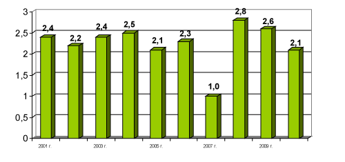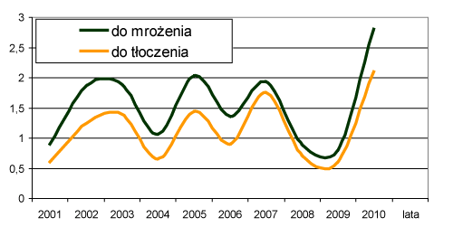 Niskie zbiory w kraju i wzrost cen eksportowych przetworów spowodowały, że ceny skupu wiśni do mrożenia i tłoczenia zwiększyły się w relacji do 2009 r. 3,5-krotnie do rekordowego poziomu – odpowiednio 2,8 i 2,1 zł/kg (rys. 3). Opłacalność produkcji wiśni w 2010 r. wyniosła ok. 120%, podczas gdy w czterech poprzednich latach produkcja ta była nieopłacalna (w 2009 r. ceny skupu stanowiły zaledwie 44% kosztów produkcji). Opłacalne będzie również przetwórstwo wiśni na mrożonki i zagęszczone soki. Marże przetwórcze w produkcji tych przetworów mogą być nawet wyższe niż w 2009/10 r.