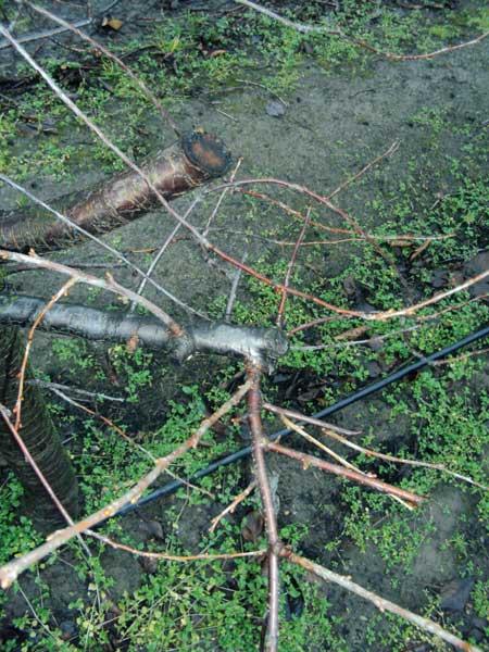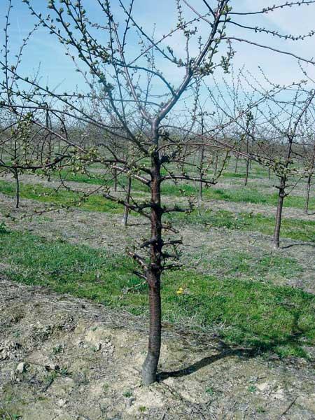 Optymalnie jest wykonywać cięcie wiśni corocznie, wówczas usunięcia wymaga stosunkowo niewielki procent gałęzi, około 20% (1-4 pędy). Niektórzy wykonują cięcie raz na 2, 3 lub 4 lata, a wówczas usunięcia wymaga około 30-50% pędów i cięcie jest intensywniejsze (fot. 6). Powoduje to jednak w kolejnym roku znaczną zniżkę plonu i powstanie pustych przestrzeni w linii rzędu. Zdecydowanie lepsze jest więc regularne i umiarkowane cięcie, które zapewni wystarczającą liczbę młodych pędów i w miarę stabilny plon.