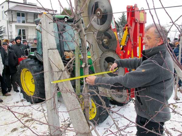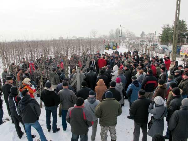 Podczas tegorocznych Sandomierskich Spotkań Sadowniczych, holenderski doradca Peter van Arkel przedstawił wykład na temat cięcia mechanicznego drzew w sadach. To podejście do kwestii cięcia nie jest nowe, gdyż próbowano je wprowadzać w życie już w latach 1970-1980 w Holandii, Niemczech i Francji. Próby z tamtych czasów nie były jednak udane i zakończyły się porzuceniem pomysłu. Powrócono do niego w 1985 roku we Francji. Tym razem udało się znaleźć przyczyny wcześniej popełnianych błędów, a stary pomysł w nowym wykonaniu – pod francuską nazwą Mur Fruitier – zyskuje coraz powszechniejsze uznanie sadowników w Zachodniej Europie, dla których koszty cięcia drzew są znaczącym obciążeniem. Do cięcia mechanicznego wykorzystuje się specjalne piły konturowe doczepiane do ciągnika (fot. 1). Pokaz tego typu cięcia zgromadził w Sandomierzu około 250 osób (fot. 2).