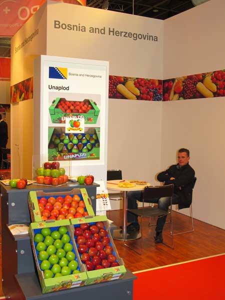 Berlińskie targi Fruit Logistica to największa na świecie wystawa poświęcona w całości owocom i warzywom. Tegoroczna edycja tej imprezy przypadła na 9-11 lutego i skupiła prawie 2500 wystawców z 84 krajów oraz ponad 56 tysięcy zwiedzających ze 132 krajów. Wśród wystawców nie zabrakło silnej reprezentacji Polski. W tym roku wspólne polskie stoisko liczyło prawie 500 m2 i skupiło 26 wystawców. Swoje oferty przedstawiło 26 krajowych firm z trzech województw: mazowieckiego (15 grup producenckich), lubelskiego (3 grupy) oraz świętokrzyskiego (8 grup). Berlińska impreza wciąż potwierdza, jak postępująca globalizacja wpływa na branżę owocowo-warzywną. W czasach, gdy transport na duże odległości nie ma już tak dużego wpływu na koszty, rynek owoców i warzyw otwiera się nie tylko na nowe, egzotyczne produkty z krajów tropikalnych, ale także na dostawców jabłek i gruszek spoza Unii Europejskiej. W tym roku jabłka pojawiły się nie tylko na stoiskach krajów specjalizujących się w ich produkcji (UE, Ameryka Północna i Południowa, Nowa Zelandia (fot. 1), RPA, Chiny (fot. 2), ale nawet w ofercie Turcji, Bośni i Hercegowiny (fot. 3), Macedonii czy Indii.
