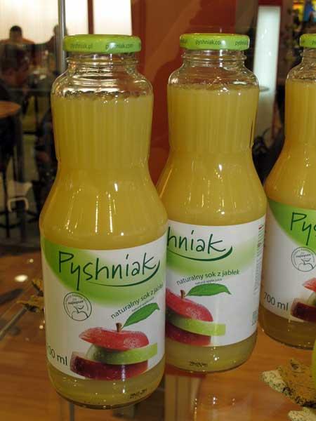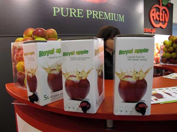 Nowością w polskiej ofercie były naturalne, mętne soki jabłkowe. Ten produkt oferowało w Berlinie dwóch polskich wystawców. Firma „Jabłuszko Handel”, założona na początku tego roku przez grupy producenckie Jabłuszko, Roja oraz Lubsad prezentowała taki sok o nazwie „Pyshniak”, pakowany w butelki (fot. 7) lub worki foliowe w kartonach (tzw. bag in box). Uruchomienie linii do jego produkcji kosztowało 3,5 mln zł, ale pozwala na zagospodarowanie owoców z gospodarstw członków grup, które normalnie trafiałyby do zakładów przetwórczych. Podobny produkt (pod marką Royal Apple), pakowany w opakowania kartonowe z workiem (fot. 8) pokazała też firma Activ. Naturalne mętne soki jabłkowe nie są jeszcze w Polsce tak popularne jak na Zachodzie, dlatego warto by wcześniej przekonać klientów, czym takie produkty różnią od soków jabłkowych oferowanych do tej pory w handlu.