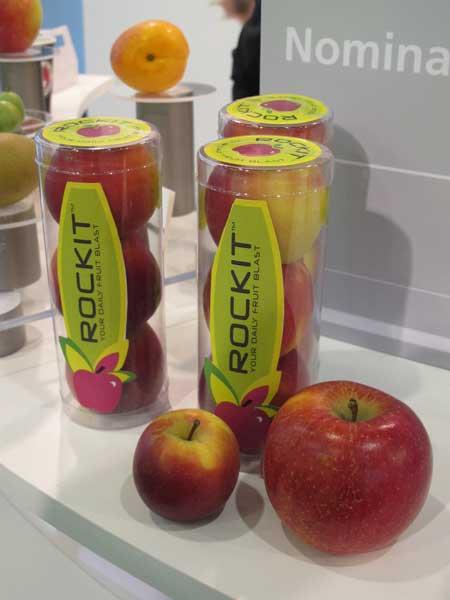 Konkursową ciekawostką była także nowa odmiana jabłek, rodem z nowej Zelandii. Do Berlina przywiozła je firma The Havelock North Fruit Company. Jabłka j odmiany RockitTM, wyróżniają się przede wszystkim niewielką średnicą – 57-63 mm (fot. 11). Kształtem, barwą oraz smakiem przypominają nieco jabłka Gali, są twarde, słodkie, aromatyczne i prawie w całości pokryte czerwonym rumieńcem. Małe rozmiary tych owoców pozwoliły na stworzenie zupełnie nowego typu opakowania dla nich. Otóż owoce umieszczane są po 5 (w przyszłości także po 3, 4 i 6 sztuk) w przezroczystej tubie ze sztucznego tworzywa, w sposób do złudzenia przypominający pakowanie piłek tenisowych w sklepach sportowych.