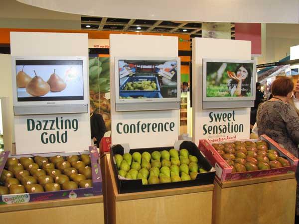 Do nagrody nominowano także wielokrotnie już opisywaną nową odmianę gruszki o czerwonej barwie skórki – Sweet Sensation®. Ten czerwony mutant ‘Komisówki’ włączyła do swojej oferty firma The Greenery International (fot. 12). Drugą nowością w ofercie tego przedsiębiorstwa była gruszka Dazzling Gold® o całkowicie ordzawionych owocach.