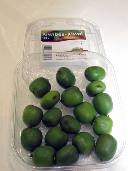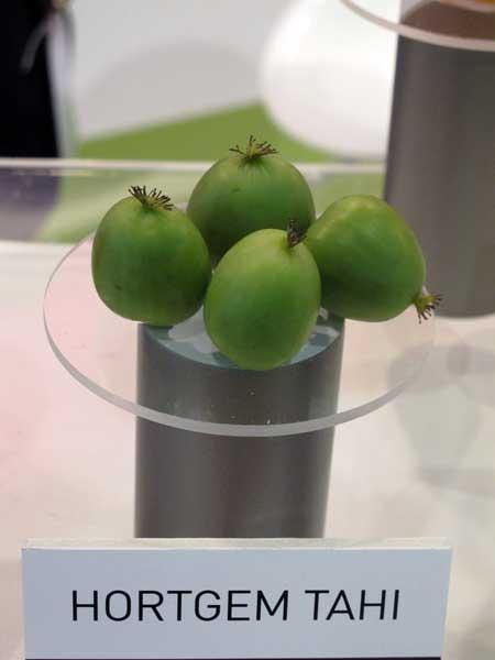 Rynek owoców jagodowych w Europie wzbogacił się o nowy gatunek, który już zagościł w handlu. Chodzi mianowicie o owoce tzw. mini kwi, czyli aktinidii ostrolistnej. Krzewy tego gatunku są odporne na niską temperaturę i tworzą owoce wielkości tych u agrestu, w smaku podobne do standardowego kiwi, ale słodsze i pokryte jadalną gładką skórką. W tym roku jagody mini kiwi były główną atrakcją stoiska belgijskiej firmy Hoogstraten (dotychczas specjalizowała się w truskawkach). Pierwsze zbiory z komercyjnych plantacji aktinidii ostrolistnej (odmiany ‘Geneva’, ‘Weiki’, Kiwino’, Issai’, ‘Ken’s Red’ oraz ‘Jumbo’) zbierano w Belgii w 2010 roku. Owoce pakowano po 125 g pod nazwą Kiwai (fot. 13 a). Do handlu trafiały tylko jagody najlepszej jakości, podczas gdy gorsze przerabiano na likier oraz dżem (fot. 13 b). Według przedstawicieli firmy Hoogstraten, za owoce Kiwai uzyskiwano w ubiegłym roku 10-15 euro/kg. Nową odmianę tego samego gatunku pokazali w Berlinie hodowcy z Nowej Zelandii. ‘Hortgem Tahi’ (fot. 14) – bo tak z maoryska brzmi jej nazwa – to jedna z 4 (obok ‘Hortgem Toru’, ‘Hortgem Wha’ i ‘Hortgem Rua’) odmian uzyskanych w tym kraju przez krzyżowanie różnego pochodzenia populacji aktinidii ostrolistnej pod kątem najlepszych cech przydatnych w produkcji towarowej.