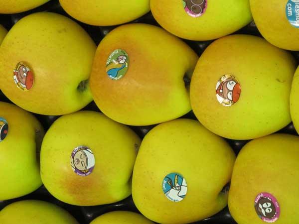 Na francuskim stoisku można było także podejrzeć sposób, w jaki tamtejsi handlowcy chcą zwiększyć zainteresowanie jabłkami wśród dzieci. Metodą ma być znakowanie owoców naklejkami kolekcjonerskimi (fot. 16) dla dzieci, aby zachęcić je do sięgnięcia (czyli namówienia rodziców na kupno) po kolejne jabłka. Zbierane z jabłek naklejki można wykorzystywać do gier planszowych i „kolorowanek” dostępnych na stronie internetowej producenta owoców.