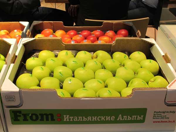 Tym, że co czwarte ekologiczne jabłko w UE pochodzi z Południowego Tyrolu, chwalono się na stoisku tego regionu, który należy do największych rejonów sadowniczych w Europie. Sady jabłoniowe zajmują tam 18 tysięcy hektarów. Mało kto jednak wie, że ta włoska prowincja przoduje również w UE w produkcji jabłek ekologicznych. Pierwsze sady ekologiczne powstały w Południowym Tyrolu na początku lat 80. ubiegłego wieku, obecnie uprawy ekologiczne zajmują tam około 4% powierzchni sadów. W 2008 roku zebrano z nich 31 tys. ton jabłek, w 2010 roku – już 41 tysięcy, co odpowiada 25% zbiorów jabłek ekologicznych w UE. Najwięcej takich owoców z Włoch trafia do sklepów w Niemczech. Są sprzedawane pod trzema markami: „Bio Südtirol”, „Bio Vinschau” lub „Bio Melany”. Na stoisku południowego Tyrolu uwagę zwracały również włoskie jabłka w opakowaniach przygotowanych specjalnie dla rosyjskich odbiorców (fot. 17).