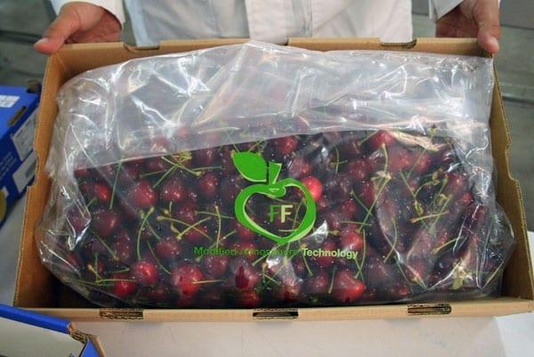 Te owoce należą do coraz bardziej poszukiwanych na rynku europejskim. W lutym w Belinie dostępne były nawet świeże czereśnie z Australii. Największym ich dostawcą do Europy poza sezonem pozostaje jednak Chile. Transport morski z tego kraju trwa jednak kilka tygodni. Warto więc przyjrzeć się jak z przechowywaniem tych owoców radzą sobie dostawcy z Chile. Czereśnie pakowane są po zerwaniu i przesortowaniu w worki (fot. 18) pozwalające na tworzenie we wnętrzu opakowań modyfikowanej atmosfery. W Berlinie pokazywała je np. chilijska firma San Jorge Packaging S.A., która dostarcza 90% tego typu opakowań w tym kraju. Folia ze zmodyfikowanego polietylenu używana do produkcji tych worków pozwala na przenikanie na zewnątrz opakowania dwutlenku węgla, a tlenu do jego wnętrza. Tak zapakowane czereśnie można – według producenta – przechowywać w temperaturze 0°C do 45 dni (czasami do 60 dni) bez strat jakości, co zdaje się potwierdzać fakt, że większość czereśni z Chile transportuje się statkami do Azji i Europy właśnie w opakowaniach wspomnianej firmy. Podobne opakowania używane są również do pakowania śliwek oraz owoców kiwi.