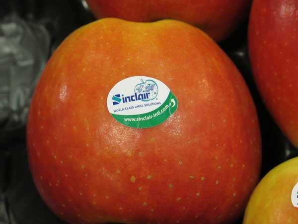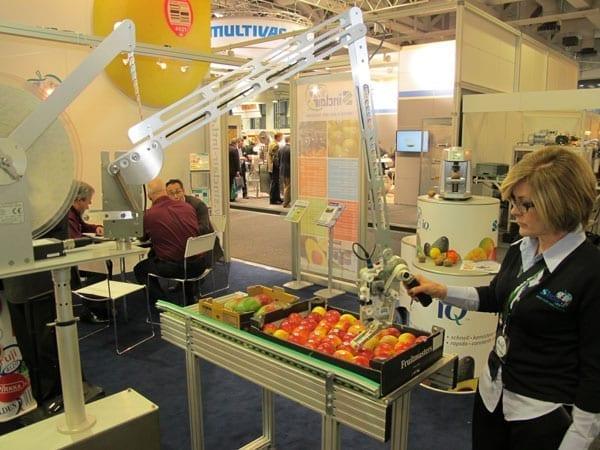 Polscy sadownicy interesowali się również się urządzeniami do etykietowania jabłek. Indywidualna etykieta na owocach pozwala wyróżnić własny towar na rynku – jabłka nie pozostają anonimowe, a klient może po nie wrócić. Urządzenia do etykietowania owoców można było obejrzeć np. na stoisku firmy stoisku firmy Sinclair. Rozwiązanie do etykietowania manualnego składa się z „pistoletu” do naklejania etykiet (nie trzeba naciskać żadnych dźwigni, wystarczy dotknąć owoc końcówką „pistoletu” – fot. 19), montowanego na specjalnej kolumnie, którą można przymocować do blatu roboczego czy ściany. Wydajność tego urządzenia wynosi do 180 naklejek na minutę. Droższe, ale i wydajniejsze jest zautomatyzowanie tego procesu – automatyczne urządzenie za pomocą kamery rozpoznaje najpierw układ owoców w opakowaniu, a potem samoczynnie nakleja etykiety. Takie rozwiązanie pozwala na użycie tego samego urządzenia dla wielu różnych opakowań z jabłkami bez potrzeby wprowadzania zmian w programie komputerowym.