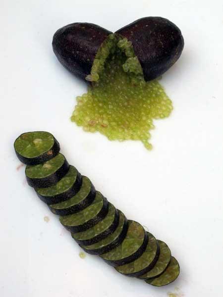 Zwycięzcą konkursu został nowy gatunek cytrusa pochodzący z Australii. Ten owoc o angielskiej nazwie „limeburst fingerlimes” ma wałeczkowaty kształt, waży 25-30 g, a jego wnętrze wypełnione jest kulistymi soczystymi, zielonkawymi cząstkami przypominającymi kawior (fot. 9).