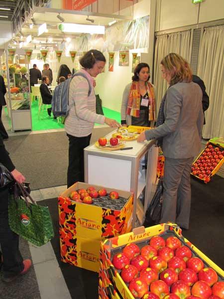 Z innych odmian jabłoni, warto zwrócić uwagę na odporną na parcha klubową odmianę Ariane®, która jest coraz bardziej rozpoznawalna na rynku, a w tym roku w Berlinie po raz pierwszy była prezentowana na „własnym, klubowym” stoisku (fot. 15). Ariane® pochodzi z Francji, gdzie już zyskała dużą popularność, obecnie Francuzi chcieliby te owoce także eksportować.
