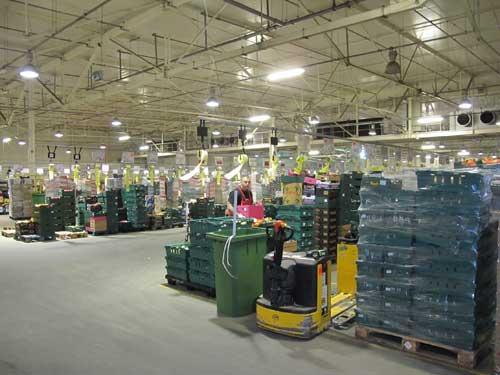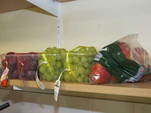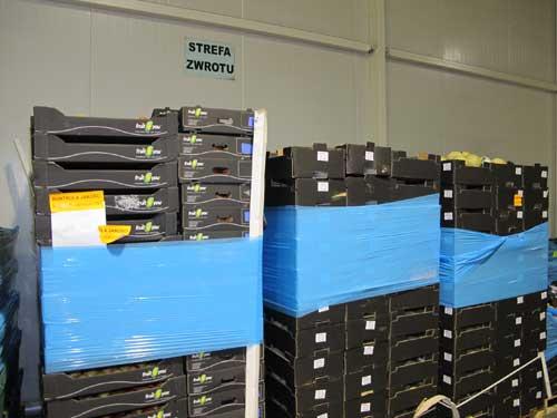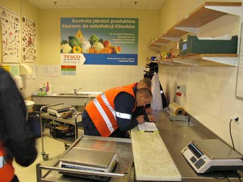 Dopiero po pozytywnym wyniku tych badań owoce z miejsca przyjęcia zostają rozdzielone do transportu do określonych sklepów (fot. 3). Z każdej partii owoców pozostawiana jest jednak próbka (fot. 4) w celu sprawdzenia trwałości towaru. Tesco na wszystkich świeżych produktach podaje datę ekspozycji („eksponować do...”), po której przekroczeniu towar jest przeceniany (dla większości jabłek ten termin wynosi 5 dni od chwili dostawy do magazynu centralnego). Produkty niespełniające wymagań specyfikacji (wykres), zostają oznakowane (fot. 5) i zwraca się je dostawcom. Według Jakuba Podgórskiego, kierownika ds. technologii produktu w Tesco, w 2009 roku na 9500 ton jabłek przyjętych do magazynu, zwroty dotyczyły tylko 1,73% dostaw. W przypadku, gruszek rocznie sprzedaje się ich w Tesco około 1000 ton (zwroty dotyczyły 1,81% dostaw).
