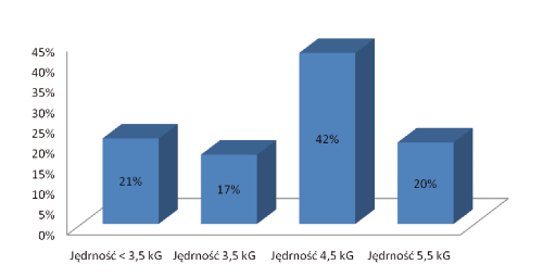 - Jędrność. Jeszcze przed pięciu laty przyjmowano, że 19% klientów preferuje jabłka miękkie, 44% – średnio jędrne (kruche), a 37% – twarde. Ostatnie badania (z odmianami ‘Jonagold’ i ‘Šampion’) wykazały jednak, że zbyt wysoka jędrność także nie jest wskazana, gdyż nabywcy odbierają takie jabłka jako mniej słodkie (rys. 2). Stąd w specyfikacjach Tesco podniesiono od bieżącego sezonu minimalną jędrność dla poszczególnych odmian: dla odmiany ‘Jonagold’ i jej sportów do 5,0 kG (było 4,8 kG), ‘Šampion’ – 4,8 kG (było 4,2 kG), ‘Rubin’ – 4,8 kG (było 4,2 kG), ‘Gloster’ – 5,0 kG (było 4,8 kG, ‘Ligol’ – 5,0 kG (było 4,8 kG).