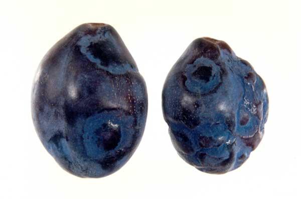 Wyraźne objawy chorobowe można obserwować na drzewach moreli porażonych PPV. Wczesną wiosną, na liściach pojawiają się chlorotyczne wzory biegnące wzdłuż nerwów bocznych (3 a). Chociaż latem objawy te zanikają lub są słabo widoczne, zmiany chorobowe można dostrzec na owocach, które pokrywają chlorotyczne lub czerwonawe plamy i pierścienie ulegające niekiedy zbrązowieniu (fot. 3 b). Owoce mają włóknisty miąższ, są zdeformowane, niesmaczne, szybko przejrzewają i nie nadają się do transportu. Na pestkach moreli zebranych z chorych drzew widoczne są jasne pierścienie (fot. 3 c).