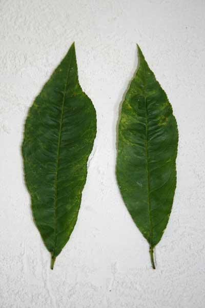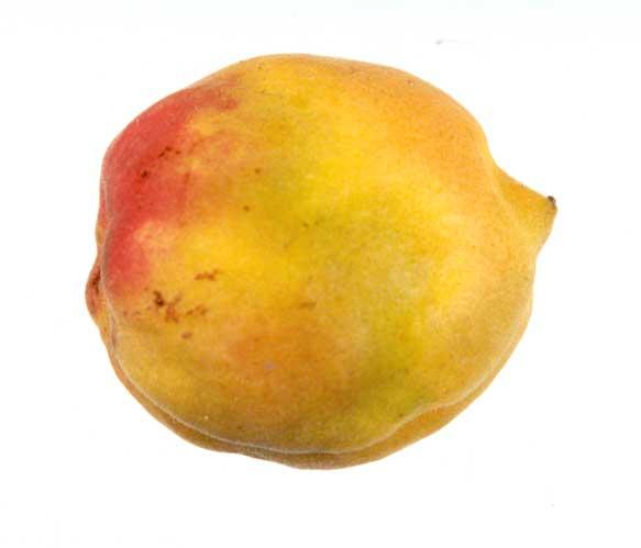 Objawy wywoływane przez wirusa ospowatości śliwy na liściach brzoskwini są mniej spektakularne. Najczęściej są trudne do zaobserwowania, lecz niekiedy, wczesną wiosną, pojawiają się ciemniejsze smugi na płatkach kwiatów (fot. 2 a), a później chlorotyczne przebarwienia lub rozjaśnienia nerwów liści i deformacja blaszki (fot. 2 b). Na skórce owoców chorych brzoskwiń mogą występować chlorotyczne pierścienie i wzory (fot. 2 c). Owoce wcześniej dojrzewają, często opadają przed zbiorem i tracą walory smakowe.